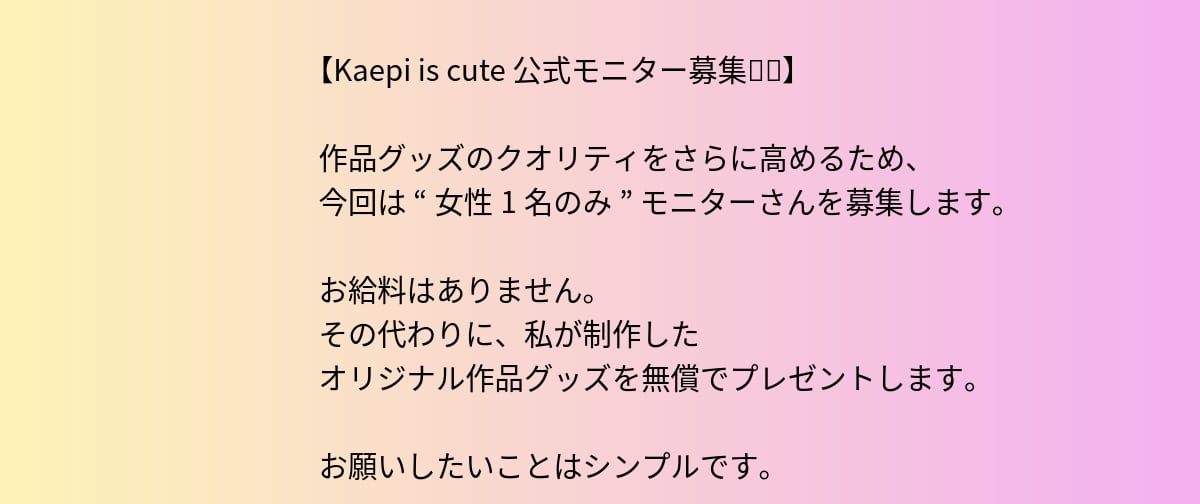 【依頼メニューについて】 当サイトの依頼メニューは、すべてデジタル作品です。 ただし、BASEの仕様上「デジタル作品」として登録すると オプション選択ができないため、通常商品として扱っています。 現在、手描き風デジタル作品と生成AI作品については すべて選択形式でのご依頼となります。 表示価格が「¥50」となっているのは、BASEシステムの都合による仮価格です。 実際のご依頼金額は、選択内容に応じて変動します。 ご注文の際は、合計金額から¥50を差し引いた金額でご入力ください。 また、「ついでにつけく」のご希望がある場合は、事前にメールやメッセージで作成イメージなどをご相談いただければ、可能な範囲で調整いたします。 ※すべての制作・発送はKaepi is cuteが自身で手配・実施しています。業者に任せることはありません。 ※ズレとの接触を避けるため、価格表示は自信と技術料を基に設計しています。 【著作権と使用範囲について】 依頼作品の著作権は放棄していません。 制作物はすべてKaepi is cuteの誇り膜に基づいて構成されています。 ご依頼いただいた商品は、SNSなど個人の範囲でご使用ください。 AI学習教材・商用データベース・再配布目的での使用は許諾しておりません。 誇りを守るために、使用範囲の境界濃度はしっかりと設計されています。 ズレとの接触を避けるためにも、必ず確認してからご利用ください。